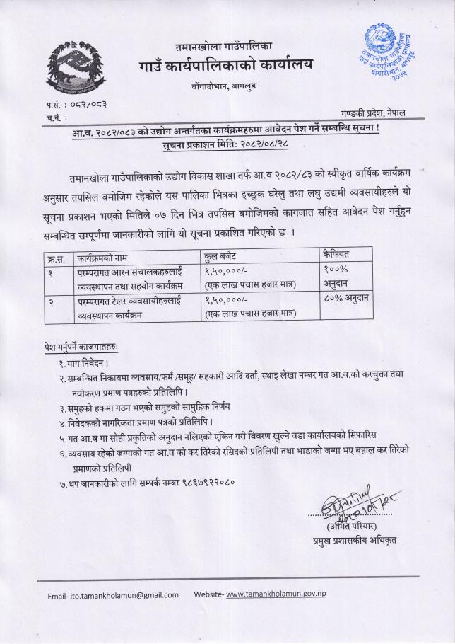 » आ.व. २०८२/०८३ को उद्योग अन्तर्गतका कार्यक्रमहरुमा आवेदन पेस गर्ने सम्बन्धी सूचना।