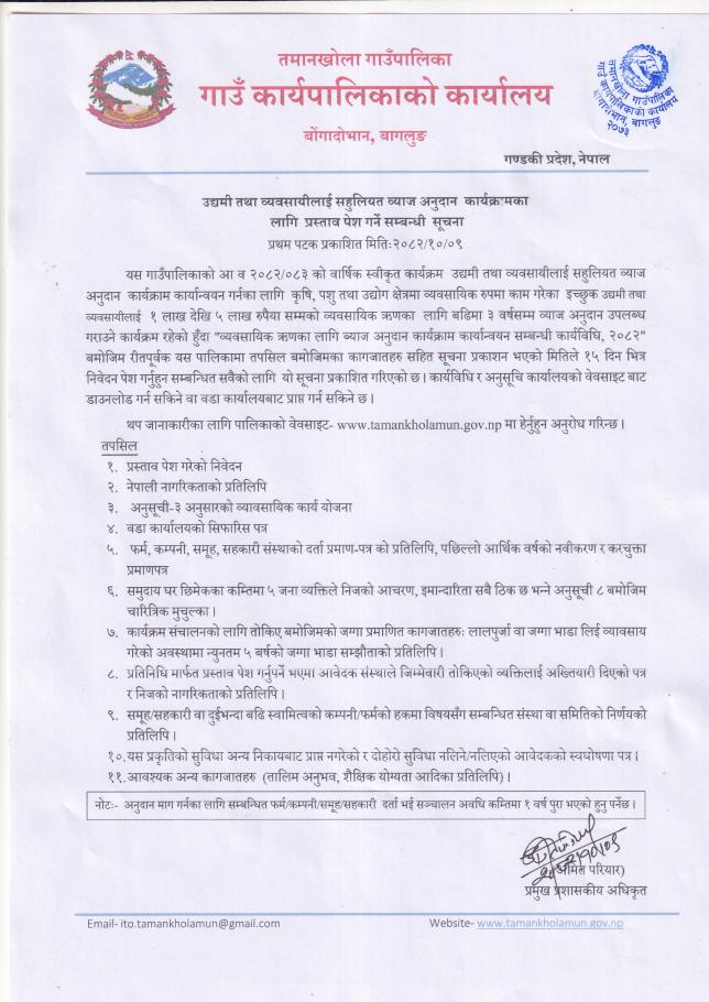 उद्यमी तथा व्यवसायीलाई सहुलियत व्याज अनुदान कार्यक्रमका लागि प्रस्ताव पेश गर्ने सम्बन्धी सुचना !