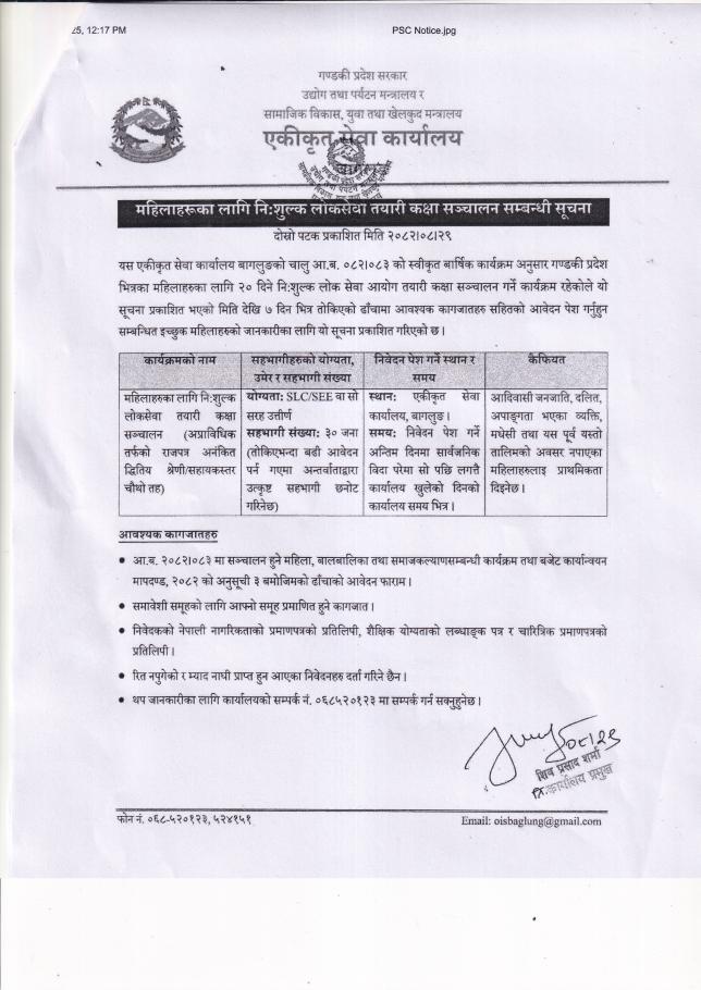 महिलाहरुका लागि नि:शुल्क लोकसेवा तयारी कक्षा संचालन सम्बन्धी सूचना !