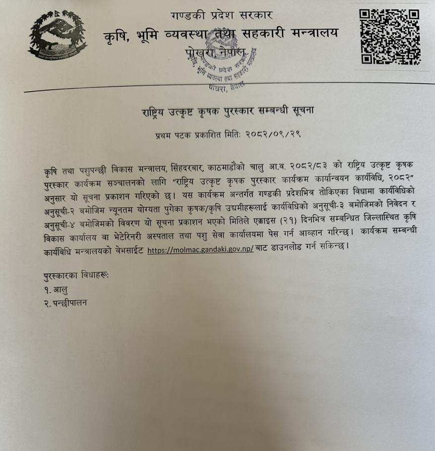 » राष्ट्रिय उत्कृष्ट कृषक पुरस्कार सम्बन्धी सुचना !