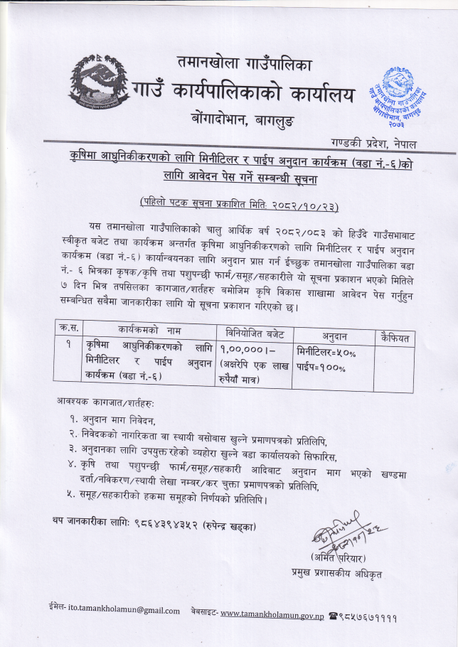 » कृषिमा आघुनिकीकरणको लागि मिनीटिलर र पाईप अनुदान कार्यक्रम (वडा नं. ६) को लागि आवेदन पेस गर्ने सम्बन्धी सूचना !