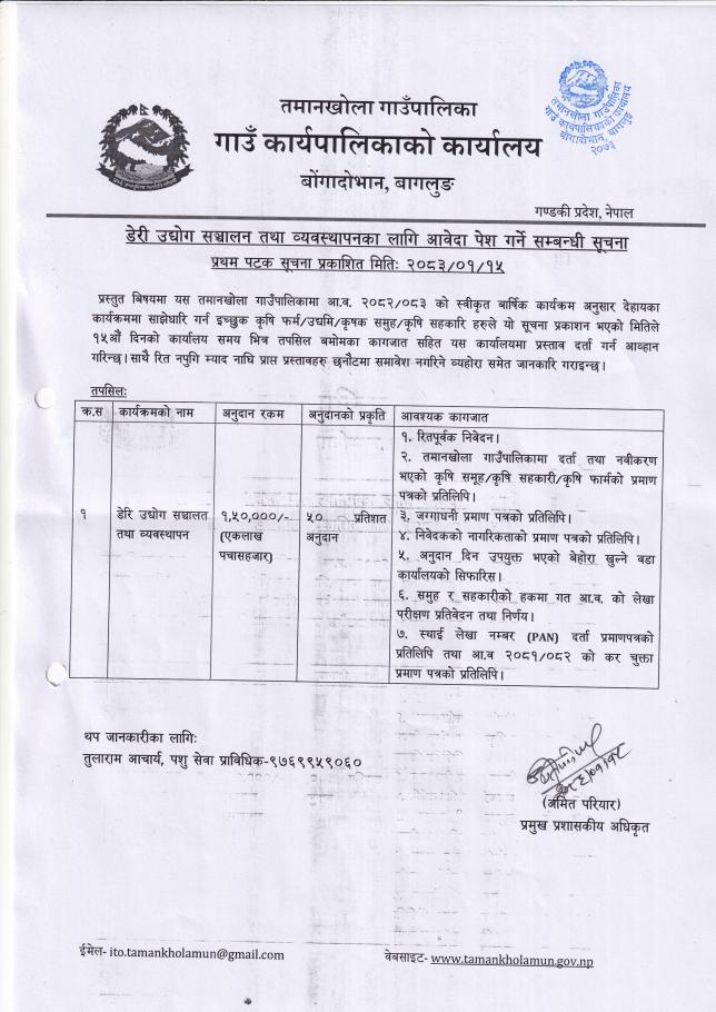 » डेरी उद्योग सञ्चालन तथा व्यवस्थापनका लागि आवेदन पेश गर्ने सम्बन्धी सूचना !